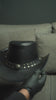 Accented with a genuine leather hat band, the design is finished with brass button studs that add a classic Western touch. The metal detailing enhances the hat’s character while reinforcing its authentic cowboy heritage. A smooth interior lining ensures a comfortable fit, allowing this black leather hat to be worn all day with ease.